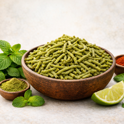 Pudina Sev is perfect for evening tea time, small hunger cravings, travel snacks, and festive gatherings. You can also use Pudina Sev as a topping on poha, chaat, or salads to enhance flavor and add extra crunch. The minty taste adds a refreshing touch that both kids and adults love.